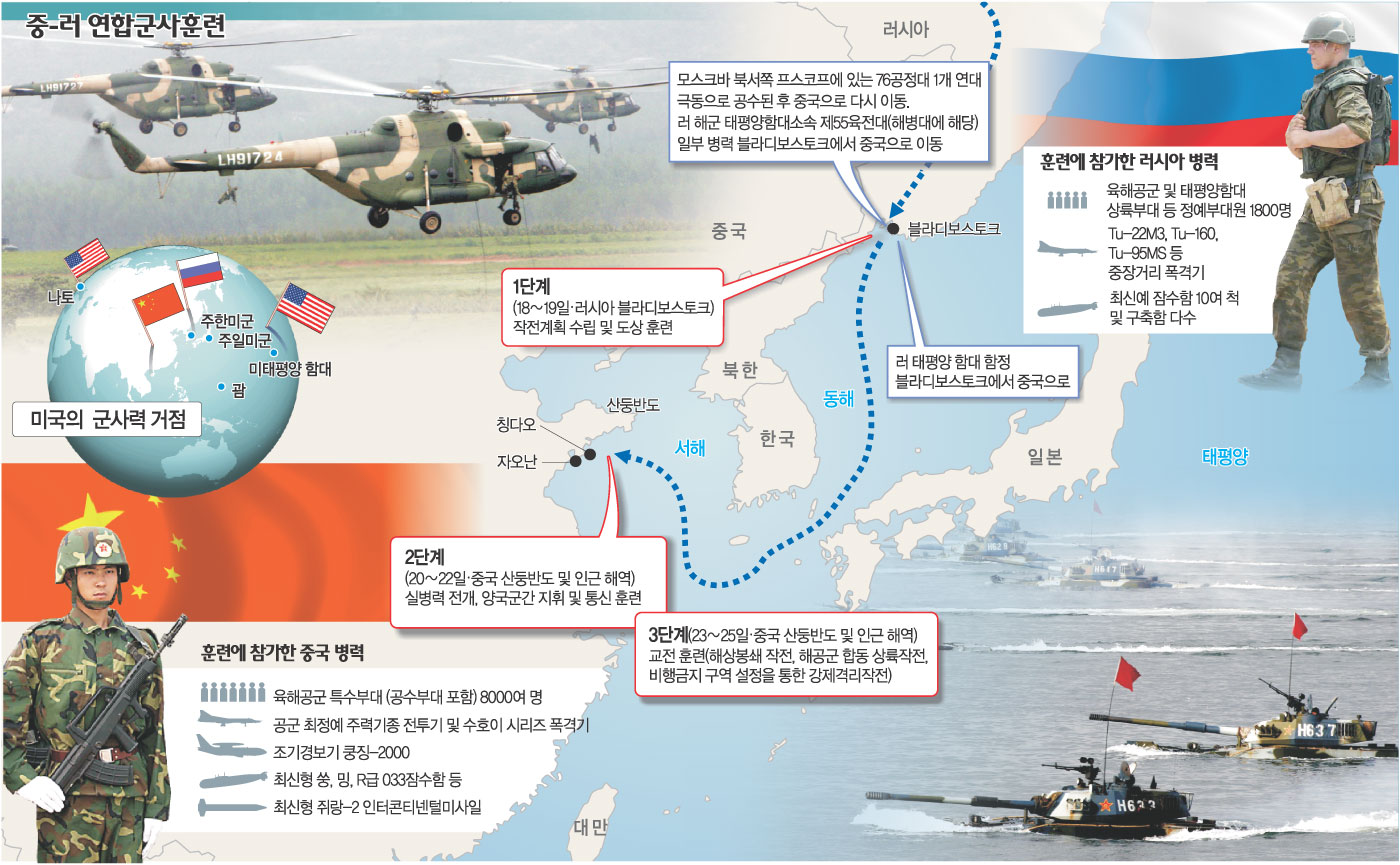 또 이번 훈련에는 양국의 최정예 부대들이 참가했다. 러시아에서는 블라디보스토크를 모항으로 한 태평양함대와 제76 공수사단, 중국에서는 칭다오(靑島)에 기지를 둔 북해함대와 지난(濟南) 군관구의 예팅(葉挺) 기계화부대가 주력이었다.
