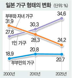 26일 일본 후생노동성 산하 인구문제연구소의 추계에 따르면 1인 가구 비율은 2000년 27.6%에서 2025년엔 34.6%로 늘어 47개의 모든 광역자치단체에서 가장 흔한 가구 형태가 된다.