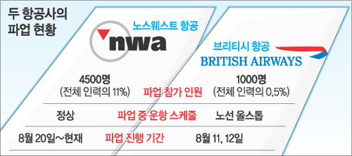 미국 4위의 항공사인 노스웨스트 항공은 28일 전체 인력(3만9000여 명)의 10%가 넘는 4500여 명의 정비사들이 9일째 총파업을 벌이고 있다. 그러나 신속한 대체인력 투입과 다른 노조원들의 동조 파업 거부로 전 세계 900개 지역 운항 일정에는 차질이 없다. 노스웨스트 항공은 정비사들이 파업에 돌입하자 2300여 명의 외부 인력을 즉시 투입했다. 9500여 명의 승무원 노조는 연대파업 투표 결과 정비사 노조의 파업에 불참하기로 결정했다.