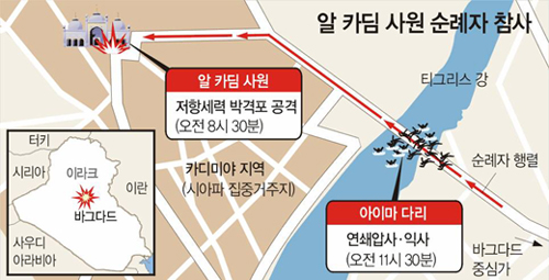 이보다 3시간 전에는 알 카딤 사원에 저항세력의 박격포 공격이 가해져 시아파 순례자 7명이 사망하고 30여 명이 다쳤다.