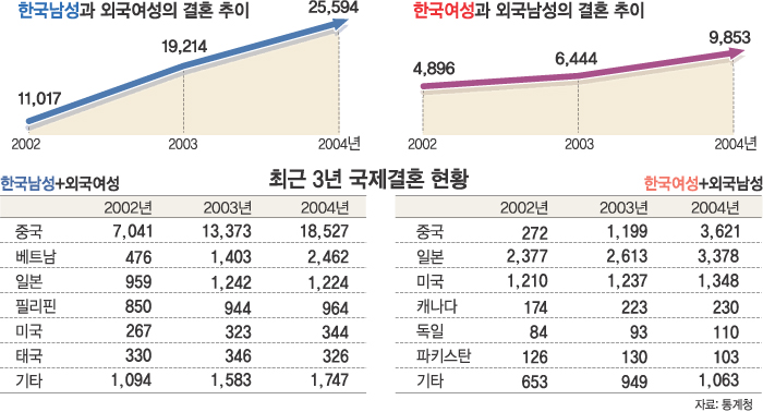 외국인과의 결혼이 늘고 있다. 통계청 자료에 따르면 결혼한 부부 12쌍 중 1쌍이 국제결혼일 정도다.