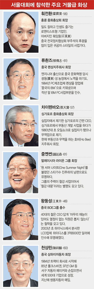 이번 대회에 참석한 화상들은 각 나라를 대표하는 거물급 기업인들이다. 이들은 풍부한 자본과 네트워크를 활용해 글로벌 기업을 사들이는 등 왕성한 사업 활동을 하고 있다. 이들 대부분은 각국에 정착해 오늘날 거부(巨富)로 성장하기까지 숱한 인고와 시련의 세월을 보내야 했다. 이번 대회에 참석한 주요 화상들의 면면을 소개한다.
