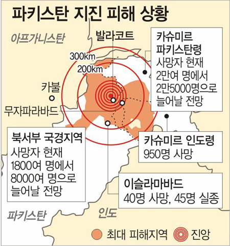 이날 샤우카트 아지즈 파키스탄 총리는 확인된 사망자만 2만2488명에 이른다고 밝혔다. 그러나 현지 데일리타임스는 “비공식적으로는 5만 명이 넘을 것”이라고 보도했다.