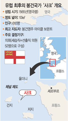영토 전부를 합쳐봐야 10km²밖에 안 되는 이 소국의 지도자는 ‘세뇌르(Seigneur)’로 불리는 대영주. 그는 매년 영국 왕에게 상징적 금액인 1.75파운드를 세금으로 바치며 섬을 다스려 왔다. 그 밑에는 대영주로부터 토지를 하사받은 수십 명의 소영주가 있으며 대다수 주민은 소영주의 땅을 일구고 매년 일정액의 지대를 바치며 살고 있다. 사크 의회는 5일 지난 5년간에 걸쳐 완성한 헌법 개정안을 폐기하고 18개월 내에 새로운 개정안을 마련하겠다고 발표했다. 지난달 영국 여왕은 개정안 내용이 “별로 개혁적이지 않다”며 승인을 거부한 바 있다.