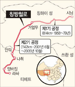 칭짱철로는 칭하이 성 성도(省都) 시닝(西寧)에서 거얼무(格爾木)를 거쳐 티베트자치구의 라싸(拉薩)를 잇는 총길이 1956km에 평균 해발 4500m 노선으로 중국이 서부대개발의 중점 사업으로 추진해 왔다.