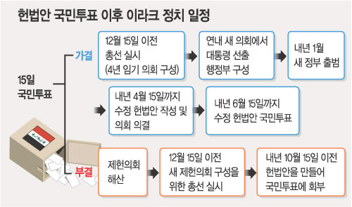 1월 제헌의회 총선 당시 투표율은 59%. 알 자지라 TV는 “1월 총선 때 수니파 밀집지역의 투표율은 2%에 불과했다”며 “투표 자체를 거부했던 수니파가 헌법안에 반대 목소리를 내기 위해 이번 투표에는 적극 참여해 투표율이 높았다”고 분석했다.