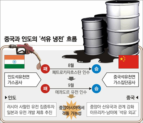 ▽초반 중국 우세=중국석유천연가스집단공사(CNPC)는 8월 중앙아시아 카자흐스탄의 3위 석유업체인 페트로카자흐스탄을 41억8000만 달러(약 4조3781억 원)에 인수했다. 반면 인도석유천연가스공사(ONGC)는 인수 경쟁 초기에 주도권을 잡았으나 결국 패하고 말았다.