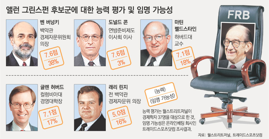 지금까지 후보군은 벤 버넝키 백악관경제자문위원회 의장, 도널드 콘 FRB 이사, 마틴 펠드스타인 하버드대 교수, 글렌 허버드 컬럼비아대 경영대학장, 래리 린지 전 백악관 경제자문위원회 의장 등으로 좁혀지고 있다.