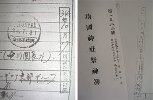 ▽불법 공문서 유출=야스쿠니신사는 1869년 메이지(明治) 일왕의 지시로 만들어진 일왕의 ‘충신’을 기리는 왕실 산하 기관이었다. 각종 전란에 휘말려 숨진 일본인 중에서도 일왕의 반대편, 막부(幕府) 편에서 싸우다 숨진 사람은 합사하지 않았다. 태평양전쟁 종결 후에는 독립된 민간 종교시설이 되었다.