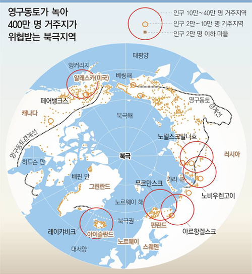 ▽사라지는 동토의 삶=북극권 가장자리에 위치한 러시아 페초라 탄전의 보르쿠타 시 13만 명 주민들도 요즘 불안한 나날을 보내고 있다. 영구동토층 위에 건설된 도시 건물의 80%가 지반이 녹으면서 붕괴 조짐을 보이고 있는 것. 북극의 온난화가 가속화되면서 북극권 8개국 400만 명 주민들의 삶의 터전이 사라질 운명에 처해 있다.