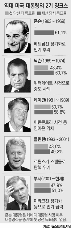 미 공영라디오(NPR)도 28일 “미국 현대사에서 재선에 성공한 대통령의 ‘2기 신드롬’이 공식처럼 반복되고 있다”며 “최악의 지지율로 고전하고 있는 부시 대통령이 과거 재선에 성공한 대통령처럼 이 같은 신드롬의 희생자가 될지 주목된다”고 지적했다.