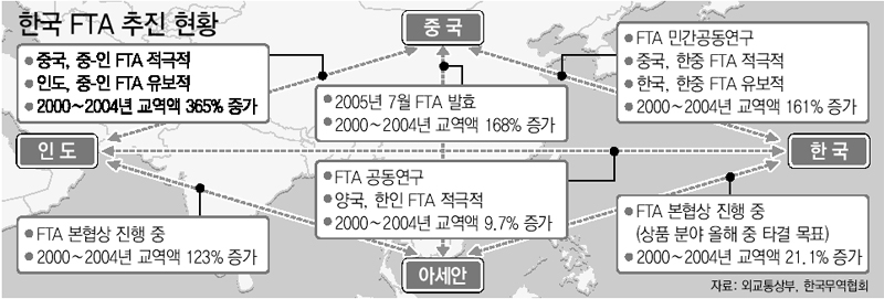 아세안은 이에 따라 올 7월 중국과 FTA를 발효시켰고, 인도와 FTA 협상을 진행 중이다. 한국과는 FTA 체결을 위한 협상을 끝내고 막바지 절충을 하고 있다.