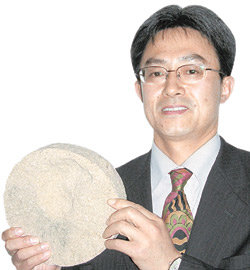 지난달 29일 일본 오사카에서 열린 한국 전통술 홍보행사장에서 누룩을 들고 한국 술을 극찬한 일본 술문화연구소 야마다 도시아키 연구실장. 그는 한국 술의 비결은 누룩에 있다고 강조했다. 오사카=조헌주 특파원