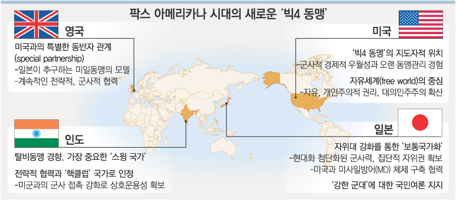 보수적 싱크탱크인 미국기업연구소(AEI)의 토머스 도널리 상임연구원은 연구소가 내고 있는 ‘국가안보전망’ 12월호에서 이른바 ‘빅4 동맹론’을 제시했다. 그는 “최근 6개월 동안 조지 W 부시 행정부가 펼쳐 온 일부 국가와의 관계망 구축 작업은 미국 영국 일본 인도의 4개국을 축으로 한 ‘빅4 동맹’의 출현을 예고하는 것”이라고 분석했다.