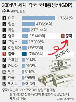 다음 주 상향 조정해 발표될 2004년 GDP에 올해 예상 경제성장률 9.4%와 7월에 단행된 위안화 2.1% 절상효과까지 감안하면 중국의 2005년 GDP는 세계 4강에 진입할 것으로 예상된다. 지난해 세계 4위는 영국으로 2조1409억 달러였다.