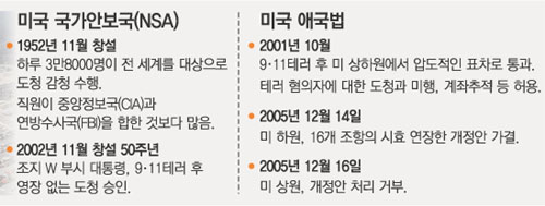 ▽NSA의 도청=부시 대통령이 9·11테러를 계기로 NSA가 미국 내에서 영장 없이 미국인과 외국인들의 국제전화를 도청하고 외국과의 e메일을 추적하도록 승인한 사실이 16일 뉴욕타임스에 의해 폭로됐다.