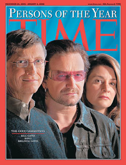 미국 시사주간지 타임이 최신호(26일자) 표지에 발표한 ‘올해의 인물’에 빌 게이츠 마이크로소프트(MS) 회장 부부와 아일랜드 록그룹 U2의 리더 보노(가운데)가 선정됐다. 타임은 “올해는 허리케인 카트리나를 비롯해 각종 재난이 헤드라인을 장식했고 6.4초마다 한 명씩 후천성면역결핍증(AIDS·에이즈)에 감염되는 등 심각한 비극들이 연출됐다”며 “이 ‘착한 사마리아인’ 세 사람이 비극을 근절하는 데 효과적으로 앞장섰다”고 선정 이유를 밝혔다. 게이츠 회장 부부는 세계 최대 자선재단인 빌 게이츠 재단을 설립하여 290억 달러(약 29조 원)를 기부해 아프리카의 불우 어린이들에게 백신을 공급하고 빈곤 퇴치에 앞장섰다. 보노는 7월 아프리카 빈곤 퇴치와 부채 탕감을 위한 자선콘서트 ‘라이브8’를 주도했다.