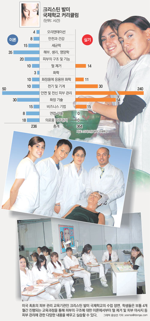 600시간으로 정해진 커리큘럼도 이 같은 틀 속에서 마련됐다. 현재 뉴욕 주가 피부관리사 면허시험을 치르기 위해서는 600시간 교육을 이수해야 한다는 점을 의무화한 것도 크리스틴 발미 국제학교의 영향이 컸다고 한다.