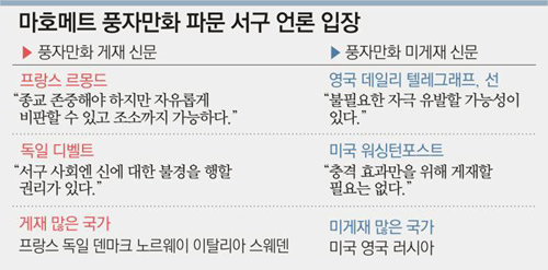 이런 가운데서도 프랑스 독일 등 유럽 대륙의 언론은 5일까지 풍자만화를 잇달아 게재한 데 반해 미국과 영국 언론은 대부분 보도하지 않아 대조적인 모습을 보였다.