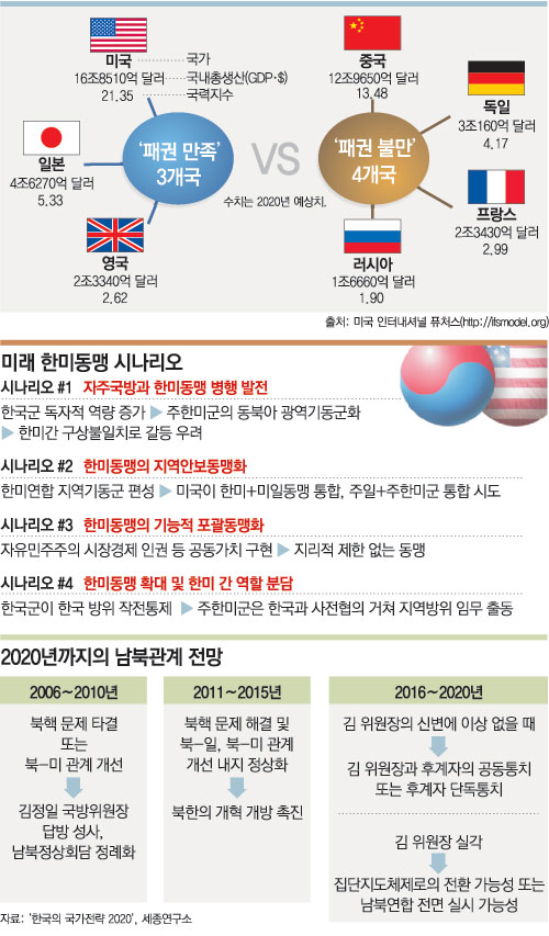 《2020년 미래 국제 질서 속에서 한국이 취해야 할 외교 안보와 통일 전략에 관한 종합보고서가 나왔다. 민간 공익 세종연구소는 최근 2020년을 대비한 한국의 국가전략 비전에 관한 ‘한국의 국가전략 2020’ 중 외교 안보 분야와 남북 관계 및 통일에 관한 보고서를 펴냈다.》