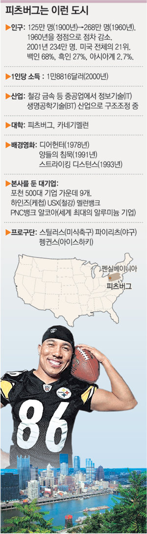 피츠버그는 20세기 중반까지만 해도 ‘세계의 대장간’이란 별명을 얻었던 철의 도시였다. 워드가 속한 풋볼 팀 이름도 스틸러스(Steelers·철인들)일 정도. 그러나 신일본제철(일본) 포스코(한국)가 등장하면서 도시는 쇠락의 길을 걸었다. 한때 30만 명을 고용했던 철강회사 USX의 현지 직원은 5000명 선으로 떨어졌다. 현재 이 도시의 최대 고용주는 피츠버그대다.