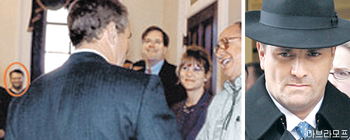 사진은 2001년 5월 백악관 옆 아이젠하워 청사에서 부시 대통령이 아브라모프 씨의 의뢰인인 인디언 부족추장 라울 가르자 씨와 악수하는 모습을 아브라모프 씨와 칼 로브 백악관 정치고문이 지켜보는 모습을 담고 있다.