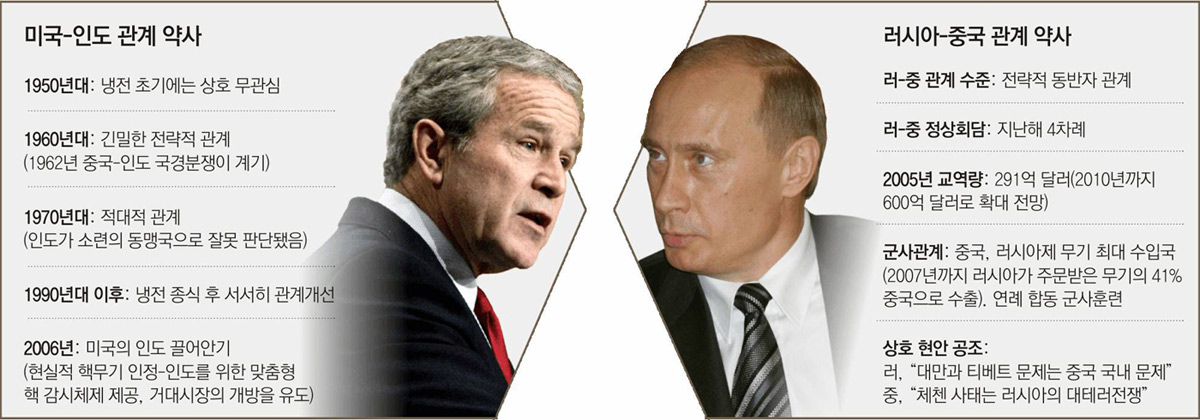 러시아는 부시 대통령의 인도 방문이 러-중-인 ‘삼각동맹’을 약화하려는 의도를 갖고 있는 것으로 보고 있기 때문이다. 1998년 삼각동맹 구상이 처음 나온 뒤 세 나라는 미국 주도의 일방적인 국제질서에 맞서 왔다. 하지만 최근 미국이 인도에 부쩍 유화적인 제스처를 보이면서 인도의 이탈 가능성이 제기되는 상황이다.