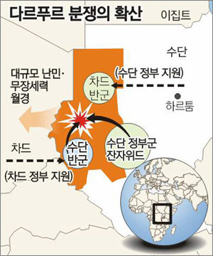 ▽다르푸르 사태의 월경(越境)=최근 수단과 국경을 접한 차드 동부지역은 낙타와 말을 탄 아랍 무장세력이 저지르는 살인 성폭행 약탈 방화로 무법천지가 되어 버렸다. 이들이 휩쓸고 지나간 마을만 수십 곳이 되고 도로엔 인적이 끊겼지만 차드군은 전혀 조치를 취하지 못하고 있다.