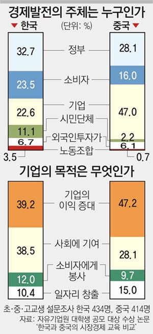 ‘경제 발전의 가장 중요한 주체’를 묻는 질문에는 중국 학생 47.0%가 ‘기업’을, 28.1%가 ‘정부’를 꼽은 반면 한국 학생은 32.7%가 ‘정부’를, 22.6%가 ‘기업’을 지목했다.