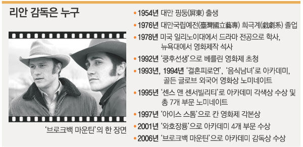 그와 오스카의 인연은 이번이 두 번째. 저우룬파(周潤發)와 장쯔이(章子怡)가 주연한 ‘와호장룡’으로 2001년 외국어 영화상, 촬영상, 미술 감독상, 작곡상 등 4개를 휩쓸었다. 그러나 이번 감독상 수상이 의미 깊은 것은 그가 서양인들의 오리엔탈리즘을 만족시킨 ‘와호장룡’ 같은 무협 영화가 아니라 가장 미국적인 소재인 카우보이를 통해 미국인의 내밀한 정서를 파고들었다는 점이다. 그는 최근 한 인터뷰에서 다음 작품을 묻는 질문에 “뭔가 중국적인 것”이라고만 말했다.