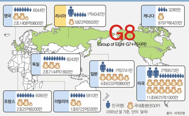 1991년 당시 G7 모임에 처음으로 초청된 러시아는 우여곡절 끝에 1998년 G8의 일원이 됐다. 러시아는 ‘강대국의 사교클럽’이라고 비아냥대면서도 국제 정치와 경제를 쥐락펴락해온 이 모임에 들어가기 위해 갖은 노력을 다했다. 옛 소련 붕괴와 함께 추락했던 국제 위상을 되찾기 위해서였다. 러시아는 나아가 이번에 G8 의장국이 된 것을 계기로 미국 중국과 함께 세계 ‘3강 구도’ 정립까지 노리고 있다.