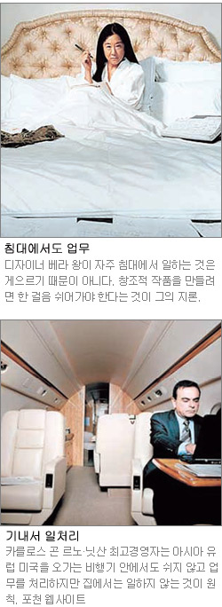 금융회사 핌코의 최고투자담당자인 빌 그로스 씨는 아예 휴대전화가 없다. 대신 그는 하루 1시간 30분씩 요가를 한다. 라플리 P&G 회장도 30분씩 명상의 시간을 갖는다. 뉴욕의 유명 여성 디자이너 베라 왕 씨는 대낮에도 몇 시간씩 침대에서 머물며 업무를 본다. 그들은 “에너지 충전을 위한 시간은 아깝지 않다”고 강조한다.