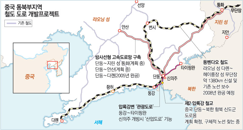 중국은 11차 5개년 계획 기간(2006∼2010년) 중 다롄에서 헤이룽장(黑龍江) 성 무단장(牧丹江)에 이르는 1380여 km 구간에 ‘둥볜다오(東邊道) 철도’를 건설할 계획이다. 신설 또는 기존 노선 개보수를 하는 공사로, 2008년 완공 목표다. 이 철도는 앞으로 동북 3성 개발의 원동력이 될 전망이다. 특히 단둥은 둥볜다오 철도가 북한의 경의선과 연결되는 곳이어서 요충지이기도 하다.