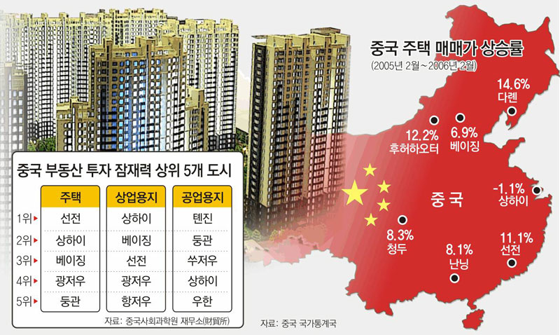 한편 중국 국가통계국이 전국 70개 중대도시의 주택가격을 조사한 결과 지난해 2월부터 1년간 평균 5.5% 오른 것으로 집계됐다.
