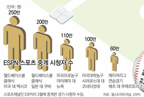그런데 미국 대 멕시코전은 시청자가 250만 명으로 미국프로농구(NBA) 경기 평균시청자의 2배에 달했다. 일본과 쿠바의 결승전도 시청자가 200만 명 선이었고, ESPN이 생중계한 경기의 평균시청자도 140만 명이었다.