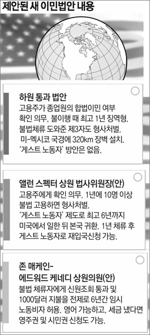 ▽처리 전망=조지 W 부시 대통령이 적극 밀고 있는 ‘게스트 노동자’ 방식은 어떤 식으로든 상원 안에 반영될 공산이 크다. 이삿짐 운반, 건설현장 막노동, 과일 수확, 호텔 청소 등 최저임금(시간당 7.25달러)에 못 미치는 임금을 받아온 이들이 추방되면 노동집약적 산업은 고사 위기를 맞거나, 급격한 가격상승이 예상된다.