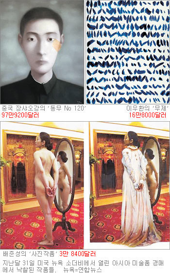 지난달 31일 뉴욕에서 열린 소더비의 아시아 미술품 경매에서도 한국 일본 중국의 현대 미술작품들이 모두 1300만 달러(약 130억 원)에 팔리는 등 기염을 토했다. 여기에서도 상당수 중국 작가들의 작품은 예상가의 4배, 많게는 10배 가까이 비싼 가격에 팔렸다.