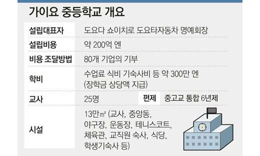 6년제 중고교 통합 과정으로 전교생이 기숙사 생활을 하는 가이요 학교는 국제사회에 대응할 수 있는 차세대 지도자를 키우는 게 목표. 일본 최대 민간기업인 도요타자동차와 JR도카이(東海), 주부(中部)전력 등 중부지역의 대표기업이 중심이 돼 설립했다. ‘지금과 같은 평준화로는 일본의 미래는 없다’는 국민적 공감대와 재계의 선도적 투자로 세워진 것.