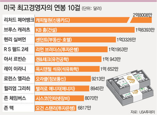 신문에 따르면 ‘(달러 표시) 억대 연봉(1000억 원 이상)’을 받은 CEO는 신용카드회사인 캐피털원의 리처드 페어뱅크(55) 회장을 포함해 6명이다. 페어뱅크 회장은 급여와 보너스는 1달러도 없지만 주가상승에 따른 스톡옵션 행사만으로 무려 2억8008만 달러를 챙겼다.