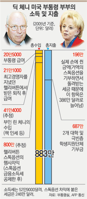 14일 백악관에서 체니 부통령의 2005년 연말정산 내용을 담은 보도자료를 돌렸다. 소득 196만 달러(약 19억 원), 납세액 52만 달러. 하지만 핼리버튼 스톡옵션 행사로 벌어들인 돈까지 합하면 총소득은 883만 달러. 역시 부자 부통령….