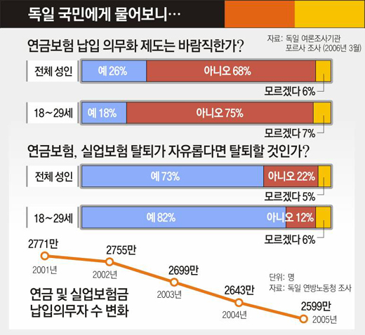 2002년부터 2005년까지 156만 명이 독일의 연금보험 및 실업보험 납부자 명단에서 사라졌다. 납부자의 5.7%가 3년 사이에 사회보장제도의 품을 자발적으로 떠난 것이다.