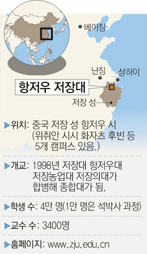 저장대는 중국 교육부의 지난해 공식통계에서 베이징대와 칭화대에 이어 3위에 랭크됐다. 이 대학의 한국인 유학생인 최미순(20·무역학과) 씨는 “통합 이후 학교의 인기가 급상승해 중국 최고의 학생들이 몰려오고 있다”며 “학생들은 학교에 대한 자부심이 대단하다”고 말했다.