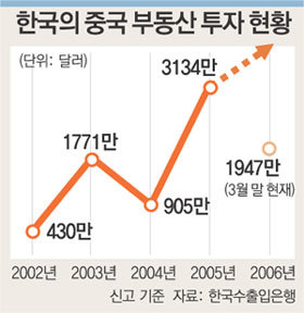한국수출입은행에 따르면 한국인의 중국 부동산 투자는 2001년 73만 달러에서 지난해 3134만 달러로 폭증했다. 올해도 3월까지만 1947만 달러를 투자했다. 개인투자는 대부분 신고하지 않는 점을 감안하면 실제 투자액은 훨씬 많을 것으로 보인다.