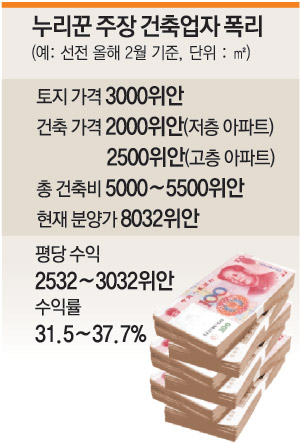 중국은 수요와 공급에 따라 분양가가 책정되는 게 아니라 건축업자와 분양업자가 일방적으로 결정한다. 그래서 아파트 분양가는 매년 10∼20%씩 마구 오른다.