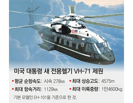 미국 월간 과학전문지 ‘파퓰러 사이언스’는 5월호에서 “지난해 1월 새 전용헬기로 선정된 VH-71의 제작이 올여름부터 시작될 것”이라며 “모두 23대가 제작되고 헬기 교체와 부대비용으로 61억 달러가 투입될 예정”이라고 밝혔다. 헬기의 대당 가격은 1억1000만 달러(약 1000억 원).