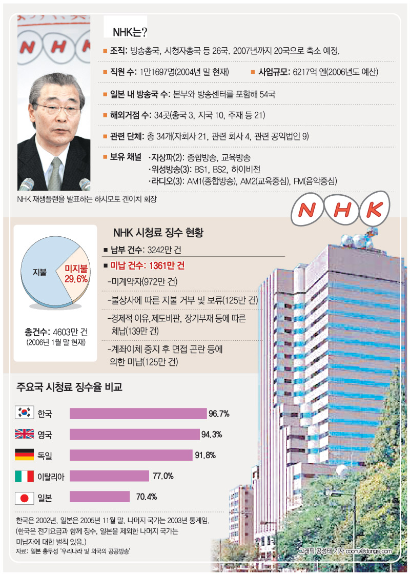 ▽NHK, “바뀌어야 산다”=일본의 공영방송 NHK가 개혁의 도마에 올라 있다. 한때는 영국 BBC에 필적하는 모범적인 방송으로 꼽히던 NHK지만 채널 8개에 직원 1만1600여 명, 예산 6200억여 엔을 운용하는 거대 공룡조직이 되면서 방만한 경영, 직원들의 도덕적 해이, 정치권과의 유착 의혹이 속속 문제가 돼 종합 수술의 필요성이 제기됐다.
