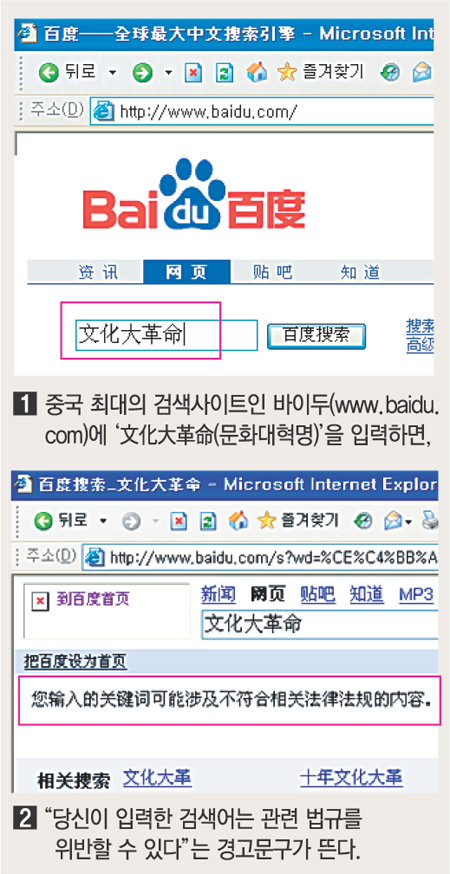 중국인이 가장 많이 이용하는 검색 엔진 ‘바이두(百度)’에 ‘文化大革命(문화대혁명)’을 쳐 넣으면 이런 경고 문구가 뜬다. 문화대혁명 자체를 알지 못하도록 심리적 억압을 가한 것이다. 검색만으로도 형사 처벌을 받을 수 있다니 으스스한 느낌이 들 정도다.