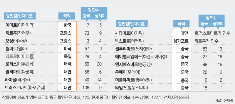 상하이에는 인구 9만 명당 할인점 1개(상하이 도심 인구 1100만 명 기준)가 있다. 할인점 시장이 포화상태라는 서울(인구 25만 명당 1개꼴)보다 3배 이상 점포밀도가 높다.