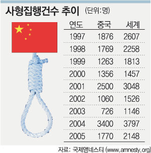 국제앰네스티(AI)에 따르면 중국의 사형 집행 인원은 2004년 3400명에 이어 지난해에도 1770명으로 전 세계 사형인원의 70∼90%를 차지하고 있다. 전 세계 사형집행 인원은 2004년 3797명, 지난해엔 2148명이었다.
