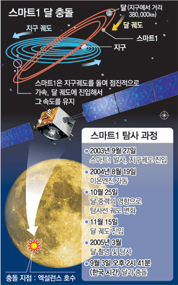 유럽우주국(ESA)은 유럽의 달 탐사선인 ‘스마트(SMART)1’이 이날 달 남반구의 ‘엑설런스 호수’에 충돌한다고 1일 밝혔다. 충돌 지점은 지름 약 161km의 거대한 분화구 안에 있는 평탄한 지형이다.